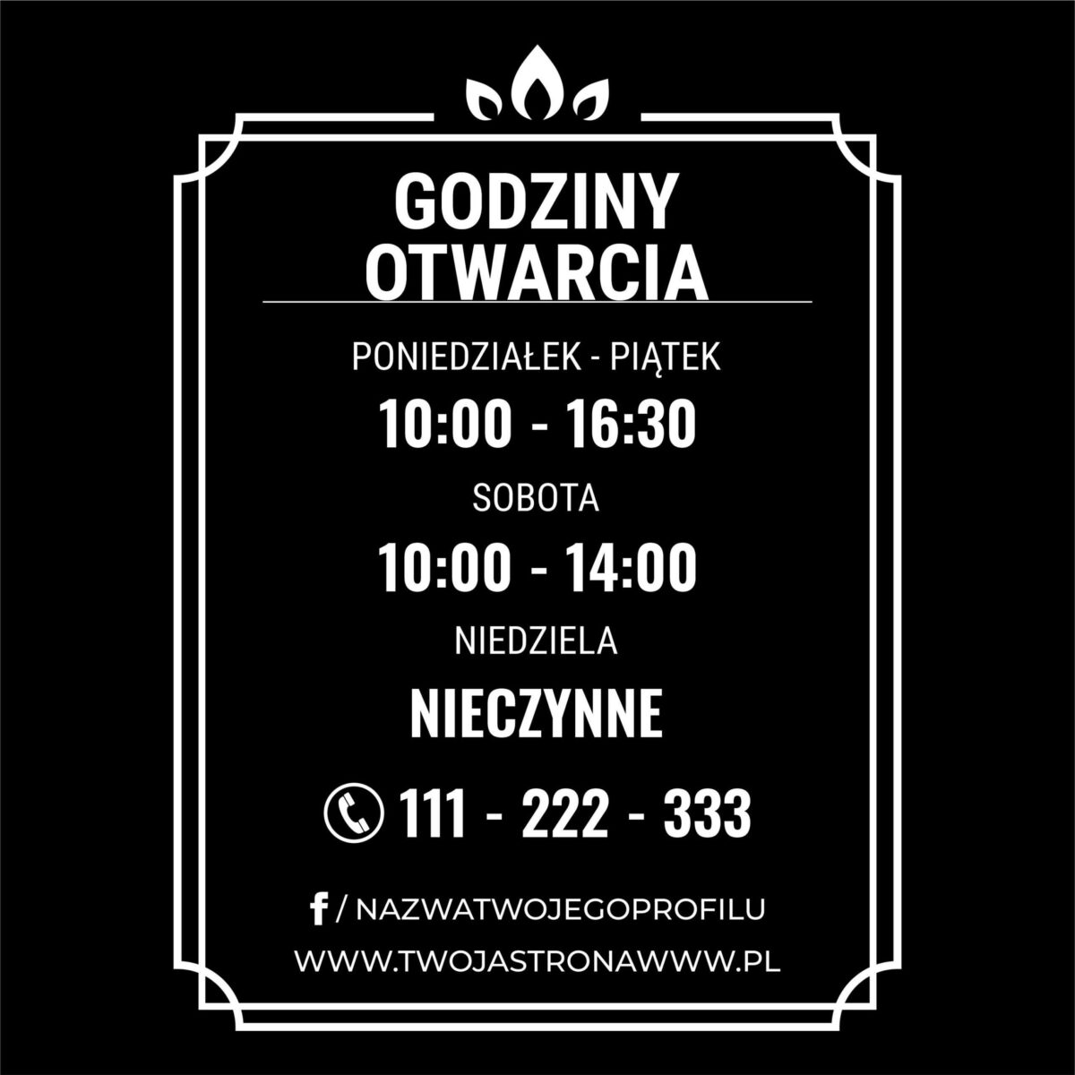 Naklejka z godzinami otwarcia wykonana z folii Oracal to produkt, który łączy w sobie estetykę, trwałość i funkcjonalność. Jest to idealne rozwiązanie dla firm, które chcą w profesjonalny sposób informować swoich klientów o godzinach dostępności usług. Dzięki wysokiej jakości materiałom oraz możliwości pełnej personalizacji, naklejka staje się nie tylko narzędziem informacyjnym, ale również ważnym elementem wizerunku Twojej firmy.